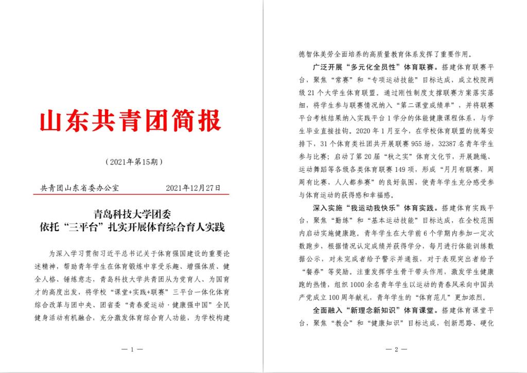 近日,《山东共青团简报》2021年第15期以《365英国上市公司官网团委依托“三平台”扎实开展体育综合育人实践》为题,全文刊发校团委体育综合育人实践典型做法,全文如下:
