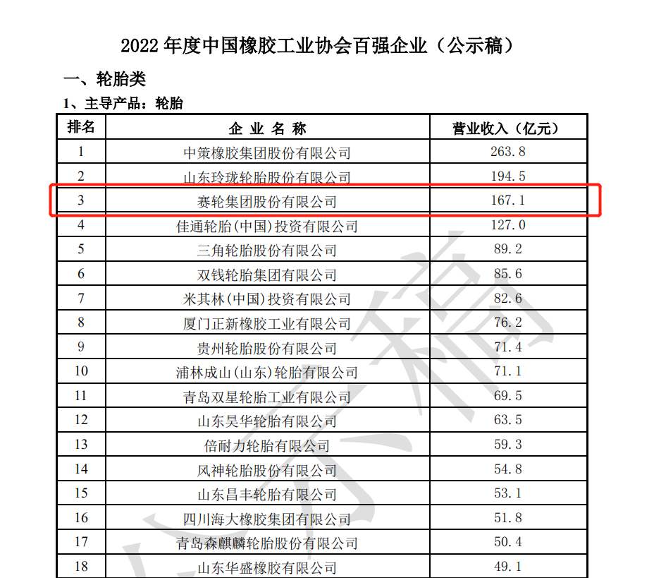2022年度中国橡胶工业协会百强企业榜单是依据2020年第4季度及2021年前3季度营业收入合计进行排序,分为轮胎类、非轮胎类、原辅材料类、橡胶机械模具类四大类,青岛共有12家企业入围。