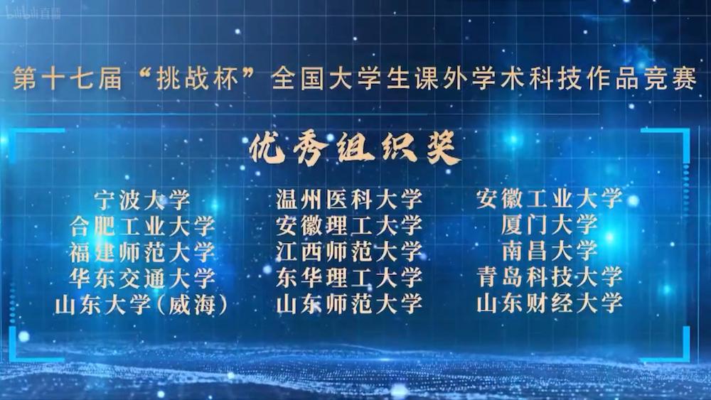 日前,第十七届“挑战杯”全国大学生课外学术科技作品竞赛表彰大会举行,我校获评“全国优秀组织奖”,全国共77所高校获评此项荣誉称号,山东共有5所高校,分别是山东大学(威海)、中国石油大学(华东),365英国上市公司官网、山东师范大学、山东财经大学。