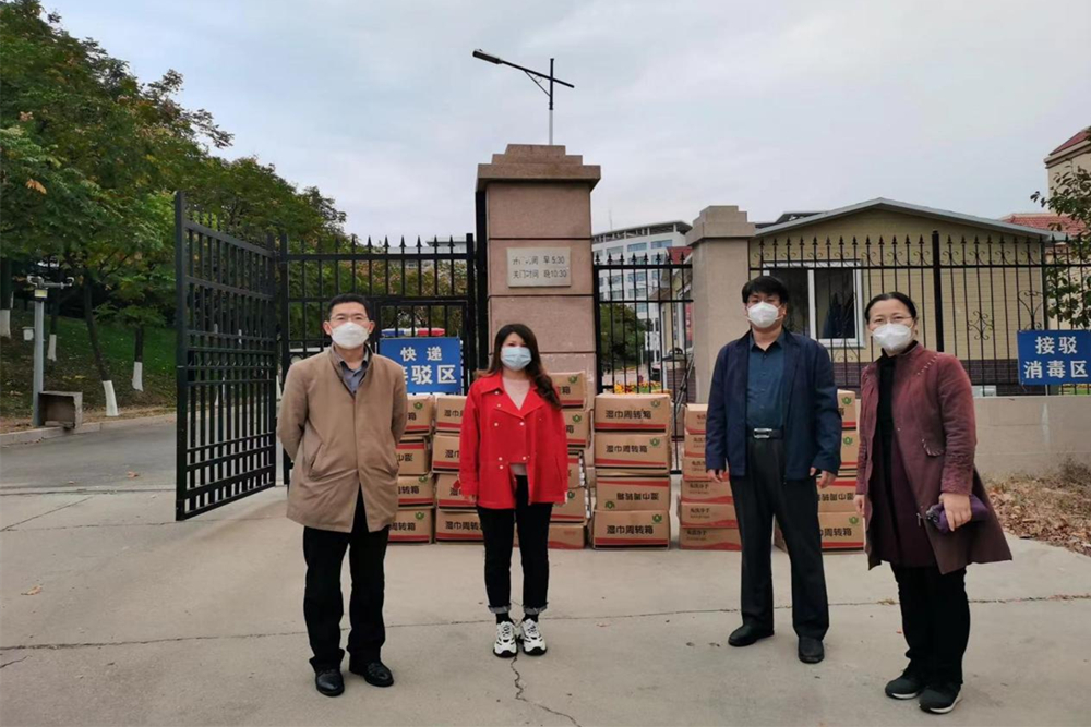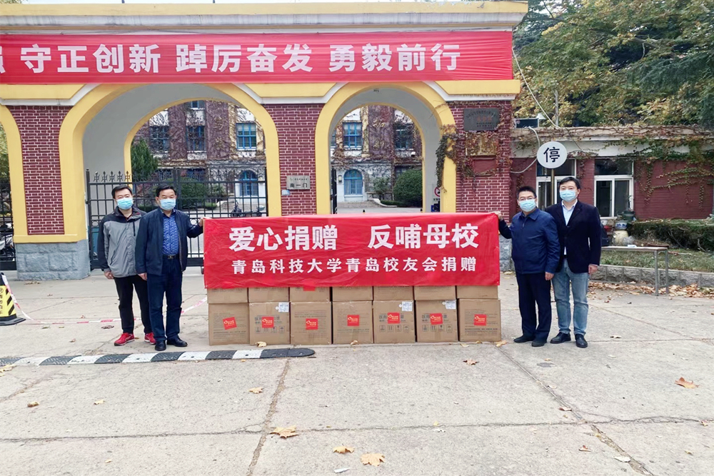 11月6日,王宇、吴海涛、张金鹏、李强代表青岛校友会向学校捐赠10万只口罩。