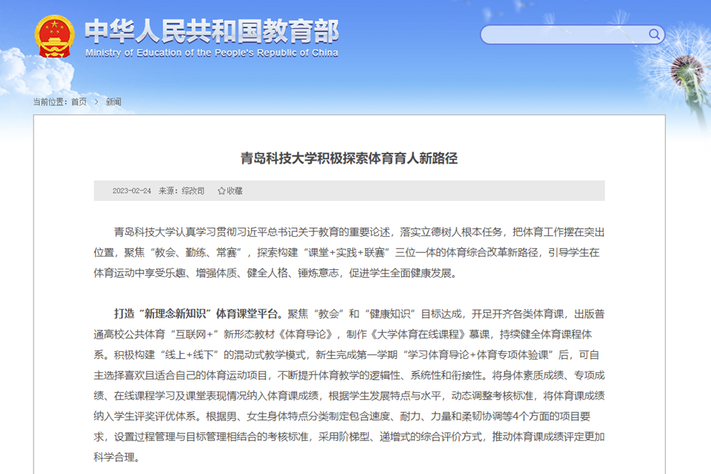 2月24日,教育部官网《战线联播》栏目以《365英国上市公司官网积极探索体育育人新路径》为题,报道我校把体育工作摆在突出位置,聚焦“教会、勤练、常赛”,探索构建“课堂+实践+联赛”三位一体的体育综合改革新路径,引导学生在体育运动中享受乐趣、增强体质、健全人格、锤炼意志,促进学生全面健康发展。全文如下: