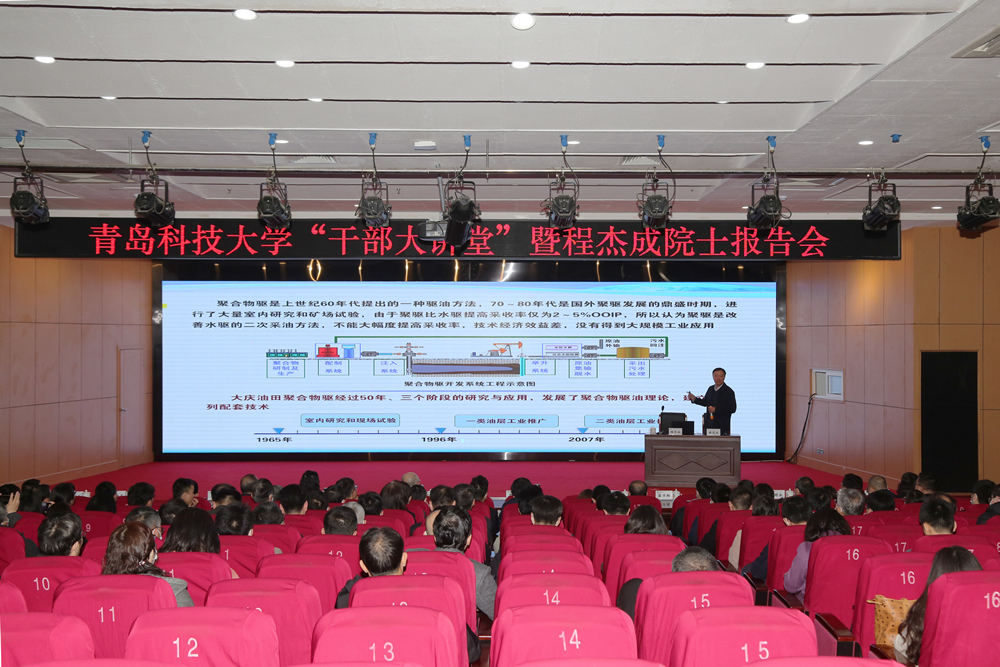 3月14日上午,学校“干部大讲堂”暨程杰成院士报告会在崂山校区第三报告厅举行。中国工程院院士、中国石油大庆油田有限责任公司首席技术专家程杰成受邀作了题为《大庆油田提高采收率技术》的报告。校党委书记李兴伟、校长陈克正及其他党政领导班子成员出席报告会,陈克正主持报告会。