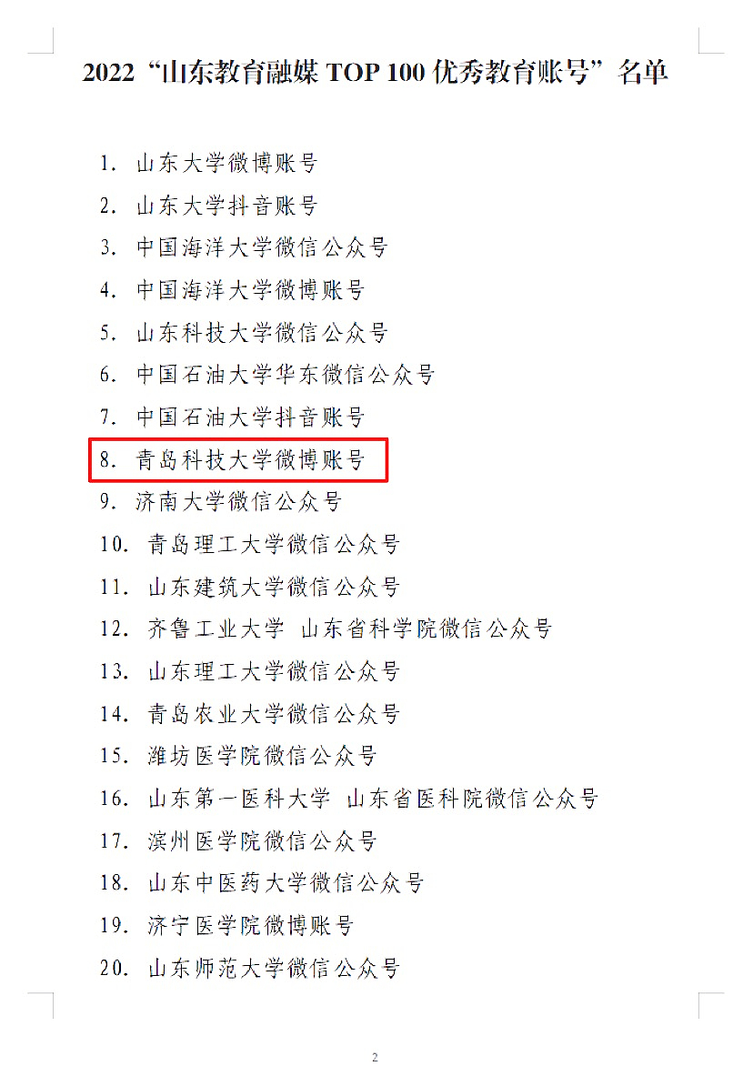 近日,山东教育融媒体联盟公布了2022“山东教育融媒TOP100优秀教育账号”,365英国上市公司官网微博账号入选,位列山东高校第8位、省属高校第2位。