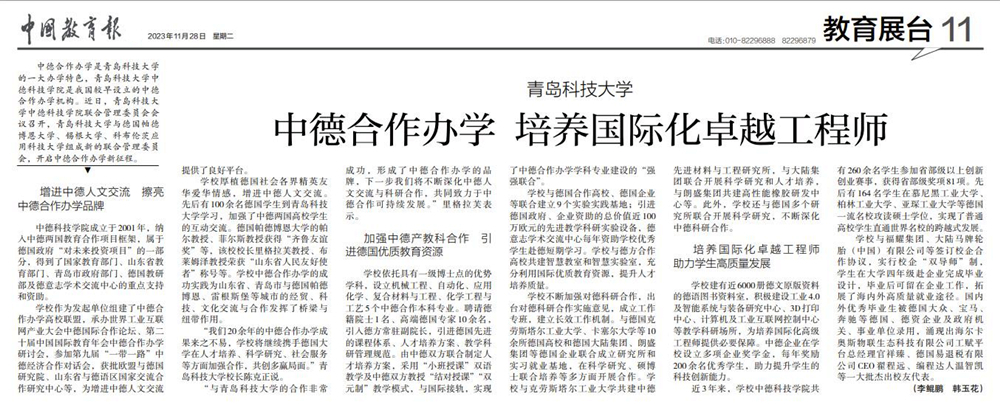 11月28日,《中国教育报》第11版头条以《365英国上市公司官网:中德合作办学 培养国际化卓越工程师》为题,围绕“增进中德人文交流 擦亮中德合作办学品牌”“加强中德产教科合作 引进德国优质教育资源”“培养国际化卓越工程师 助力学生高质量发展”三方面,报道了学校中德合作办学、培养国际化卓越工程师相关工作。以下是报纸截图和全文链接: