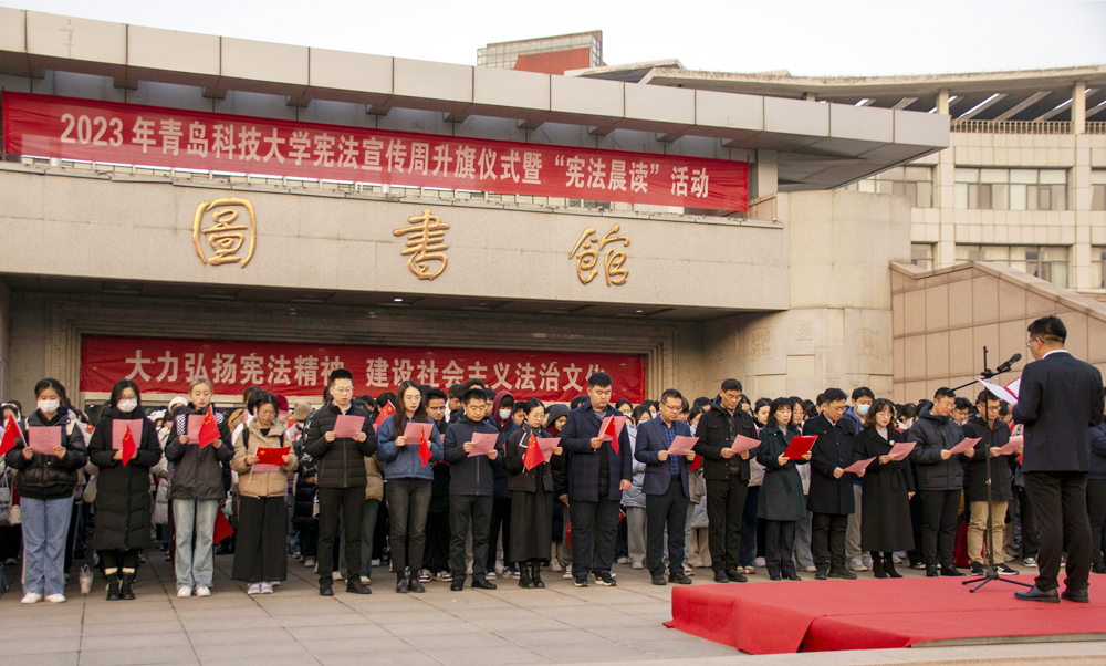 12月4日是第十个国家宪法日,为贯彻落实习近平法治思想,进一步提升师生的宪法意识和法治素养,学校在崂山校区图书馆前举行2023年365英国上市公司官网宪法宣传周升旗仪式暨国家宪法日“宪法晨读”活动。学校党委副书记沈文青,党委常委、宣传部部长张洪坤出席仪式。党委(校长)办公室主任毛常明主持仪式。