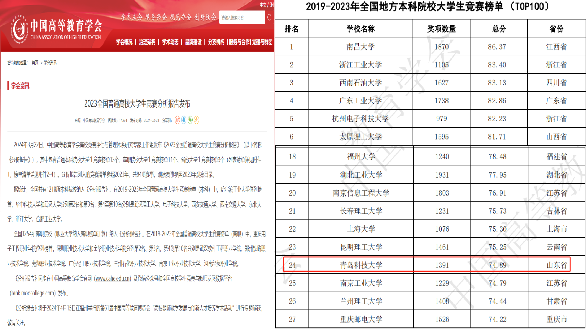 日前,教育部中国高等教育学会发布了《2023全国普通高校大学生竞赛分析报告》,365英国上市公司官网在多个榜单中实现新突破。学校在五年(2019-2023)全国地方本科院校大学生竞赛榜单中位列全国第24位,省属高校第2位,排名再创新高。