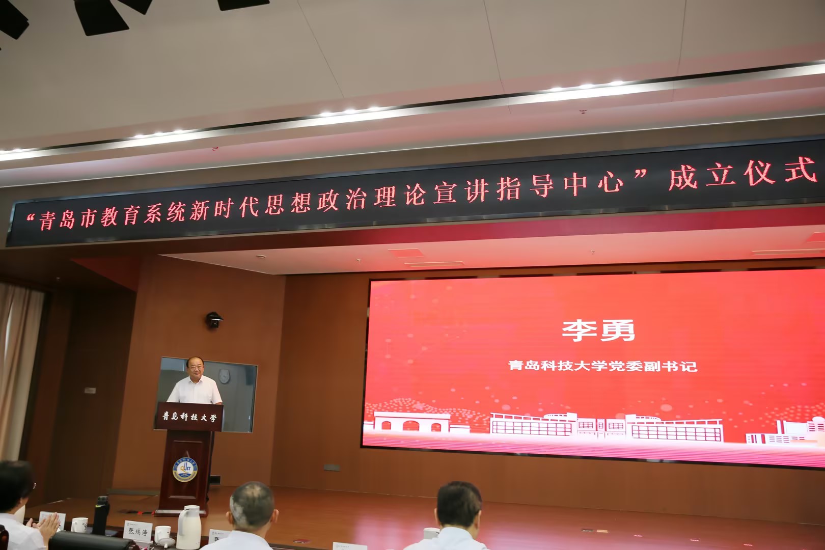 李勇在致辞中对青岛市委教育工委(市教育局)长期以来对学校发展给予的支持和帮助表示衷心感谢,向与会嘉宾表示热烈欢迎,向本次活动的举办表示祝贺。他指出,学校党委牢记“为党育人、为国育才”的初心使命,坚持不懈用习近平新时代中国特色社会主义思想凝心铸魂,坚持思政课建设向改革创新要活力的实践导向,坚持思政课建设与党的创新理论武装同步推进,开拓了学校“大思政课”育人新格局。青岛市教育系统新时代思想政治理论宣讲指导中心的成立,是全面推进“大思政课”建设的又一生动实践,是深化新时代学校思想政治理论课改革创新的又一鲜活载体,为推进学校思想政治工作形式创新、增强思想政治教育实效性提供了新支撑、注入了新活力,对推动党的创新理论真正“飞入寻常百姓家”,引导师生筑牢信仰之基、补足精神之钙、把稳思想之舵具有重要意义。