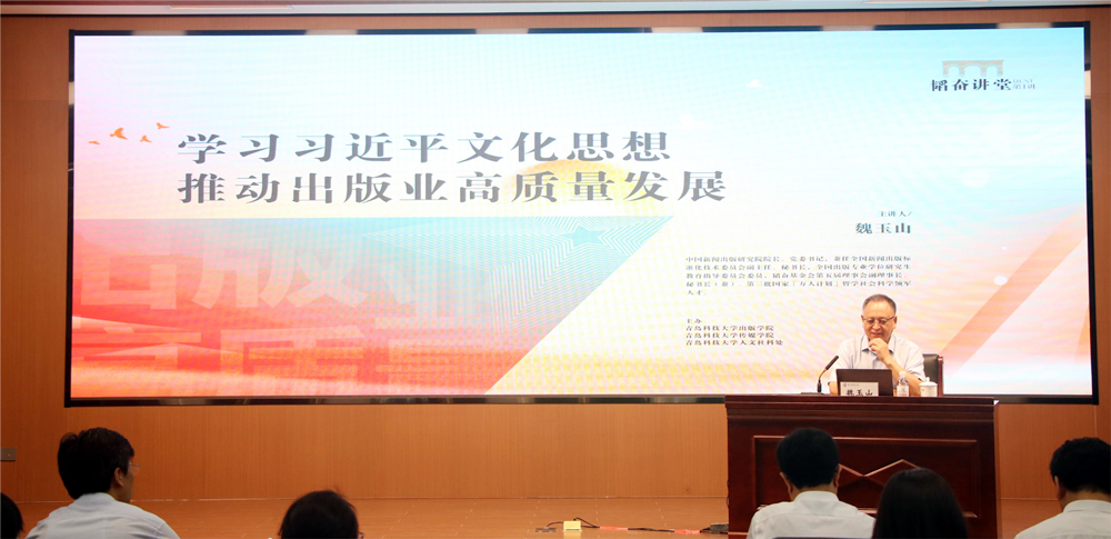 为促进出版学科高质量发展,提高出版人才培养质量,弘扬“韬奋精神”,6月28日上午,学校“韬奋讲堂”首场讲座在崂山校区软控学术报告厅开讲。中国新闻出版研究院院长魏玉山受邀作专题讲座。学校党委书记李兴伟出席讲堂并与魏玉山进行了深入交流,传媒学院院长张洪坤主持讲座。