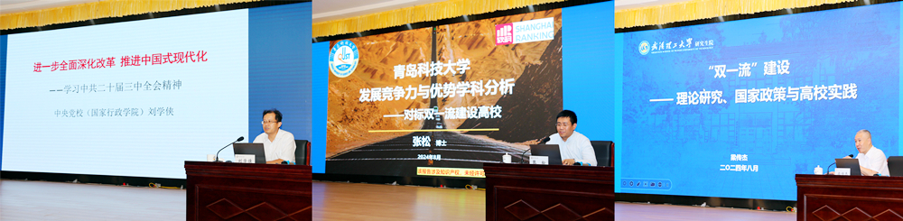会议期间,邀请了中共中央党校(国家行政学院)刘学侠教授,围绕学习贯彻党的二十届三中全会精神作专题报告;上海软科研究院张松副院长,围绕学校发展竞争力与优势学科分析作专题报告;武汉理工大学研究生院梁传杰院长,围绕一流学科建设作专题报告。