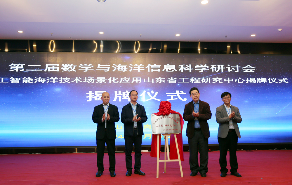 仪式上,罗细亮、乔方利、数理学院院长杨树国、青岛阅海信息服务有限公司董事长艾波教授共同为人工智能海洋技术场景化应用山东省工程研究中心共同揭牌。