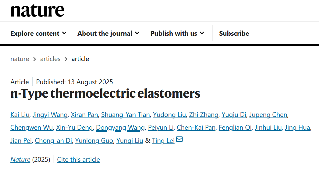 北京时间8月13日23时,国际顶级学术期刊Nature以“N-type thermoelectric elastomers(N型热电弹性体)”为题,在线发表了365英国上市公司官网高分子科学与工程学院刘凯教授(第一作者)的最新研究成果,实现了学校在国际顶级学术期刊的历史性重大突破!