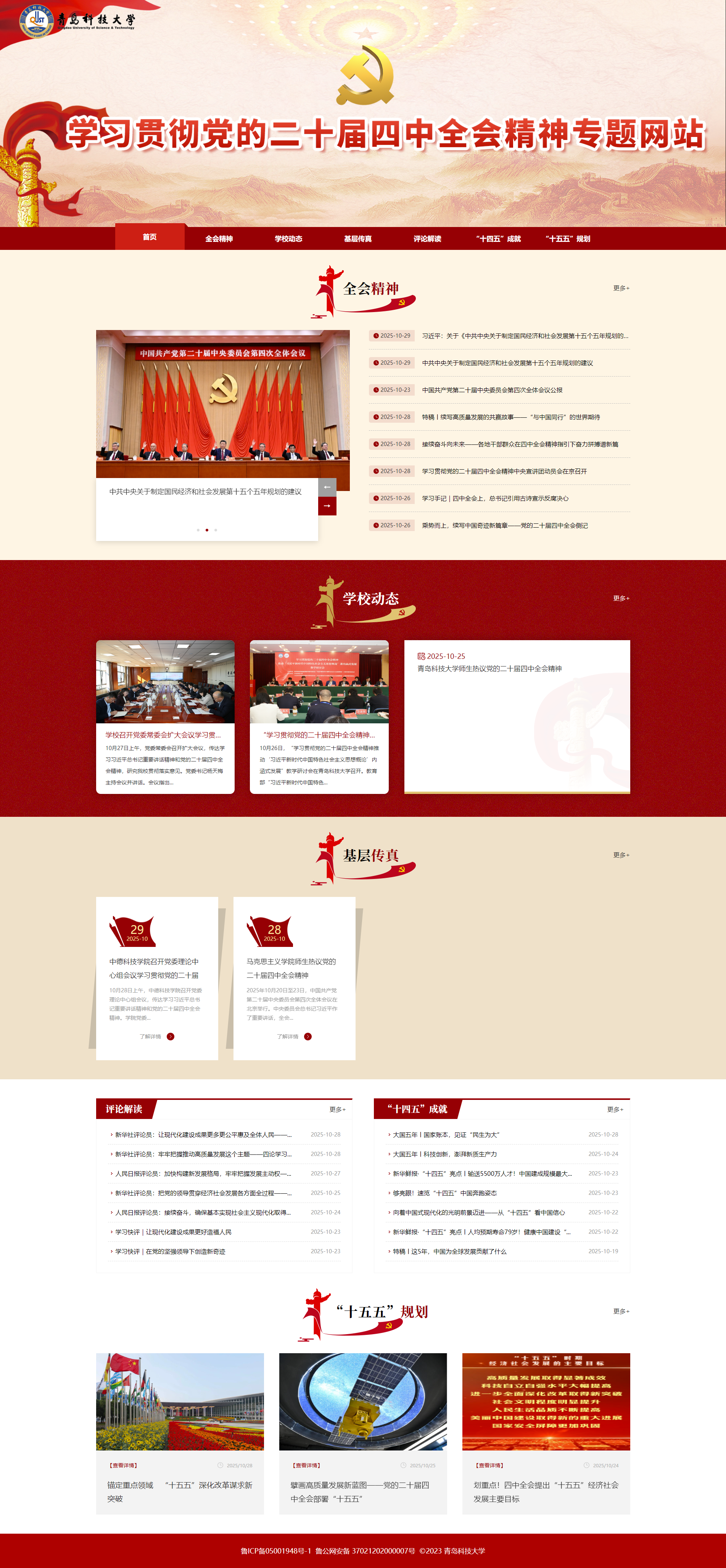 专题网站设置“全会精神”“学校动态”“基层传真”“评论解读”“‘十四五’成就”“‘十五五’规划”等6个版块。“全会精神”版块聚焦党的二十届四中全会公报全文、习近平总书记系列重要讲话原文及重要文章,同步整合中央主流媒体权威报道与解读素材,为师生准确把握全会精神核心要义、领会精神实质提供权威参考。“学校动态”版块实时更新学校层面学习贯彻全会精神的整体部署、专题会议、集中学习、实践活动等重要信息,全面展现学校推动全会精神融入教育教学、管理服务的具体举措与进展。“基层传真”版块聚焦院级单位,挖掘并展示基层组织结合工作实际开展的特色学习活动、经验做法与实践成效,呈现全校上下联动、层层落实的浓厚氛围。“评论解读”版块转发中央主流媒体评论文章,特邀校内外专家学者撰写理论阐释文章,结合教育领域发展实际与学校办学特色,对全会精神进行深度解读,帮助师生打通理论学习与实践应用的衔接通道。“‘十四五’成就”版块除展示国家、省市“十四五”期间高质量发展成就外,还将通过图文、数据、案例等形式,系统梳理学校“十四五”期间在人才培养、学科建设、科研创新、社会服务等方面取得的标志性成果,为广大党员干部师生学习贯彻全会精神与促进学校高质量发展的内在联系提供现实依据。“‘十五五’规划”版块聚焦国家、省市及学校“十五五”时期发展目标、重点任务与实施路径,重点展现学校以全会精神为指引,谋划未来发展的战略思考,凝聚师生共同推动学校高质量发展的共识与力量。