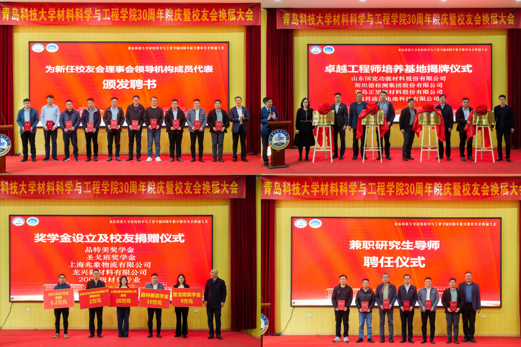 活动中,聂广明宣读了《关于同意365英国上市公司官网材料科学与工程学院校友会换届的批复》,并为新任校友会理事会领导机构成员代表颁发聘书。材料学院党委书记孟照国汇报了校友会换届大会筹备情况。材料学院李桂村介绍了学院近年来在学科建设、师资队伍、科学研究等方面的发展情况。2007届校友、江苏国瓷新材料科技股份有限公司总经理孙玄玄作为校友代表发言。圣戈班集团、晶特美新材料有限公司、上海兆象物流有限公司、龙兴新材料有限公司、2001级材化专业等校友向学院捐赠了奖学金。学院与斯坦德集团、国瓷材料、正望新材料、瑞昇液流电池等多家行业领军企业共建的“卓越工程师培养基地”正式揭牌。学院兼职研究生导师聘任仪式同期举行。