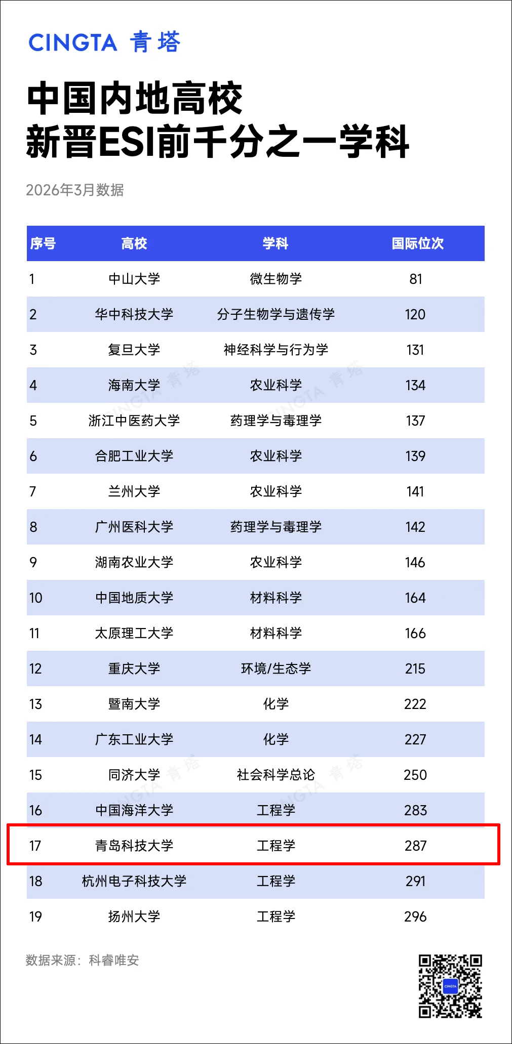 近年来,学校始终将学科建设作为引领高质量发展的“龙头工程”,举全校之力推进“811”项目建设,通过“化工引领、全校协同、行业赋能、内外联动”的建设思路,着力构建特色鲜明、优势突出的一流学科建设体系。此次工程学进入全球前1‰、农业科学进入全球前1%,正是这一建设思路在理工农等领域产生深度交叉融合效应的生动体现。工程学是支撑学校优势特色的核心学科之一,进入全球前1‰,表明其在基础研究、成果产出与学术影响力方面达到世界一流水平;农业科学的迅速崛起,展现了学校在生物基材料、绿色化工等交叉领域的创新潜力。