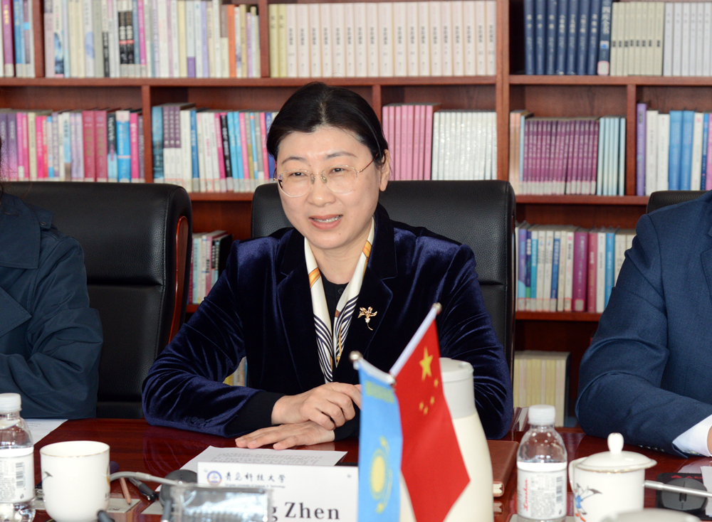 王震对代表团到访表示欢迎,并详细介绍了学校的发展战略与办学特色。她表示,学校始终秉持国际化发展理念,深化与哈萨克斯坦高水平大学的合作是学校推进国际化战略的关键举措。自今年2月学校与哈萨克国立技术大学正式建立合作伙伴关系以来,开局良好、稳步推进,坚信未来两校在师生交流、科研合作、研究生联合培养等方面必将取得扎实成效。此次代表团来访,是双方进一步增进相互理解、巩固可持续战略伙伴关系的重要契机,必将有力推动双方拓展合作领域、提升合作层次,共同构筑高层次创新人才培养的新路径,为服务“一带一路”科技人文交流、增强全球人才治理能力贡献重要力量。